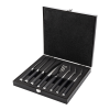 The Katana Saya Saya Pakkawood 8 Pce Knife & Fork Set includes 4 steak knives and 4 forks. Each knife and fork is made from premium stainless steel. The knives feature strong serrated edges to cut through meat effortlessly. This knife and fork set is supplied in an attractive wooden gift box for perfect presentation and offer a superb dining experience.